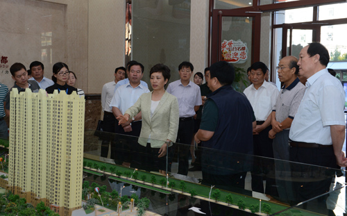 市委書記王宇燕(左二)、市委常委、常務(wù)副市長王殿民(右二)、市建設(shè)局長靳虎剛(右一)調(diào)研信合名都小區(qū)